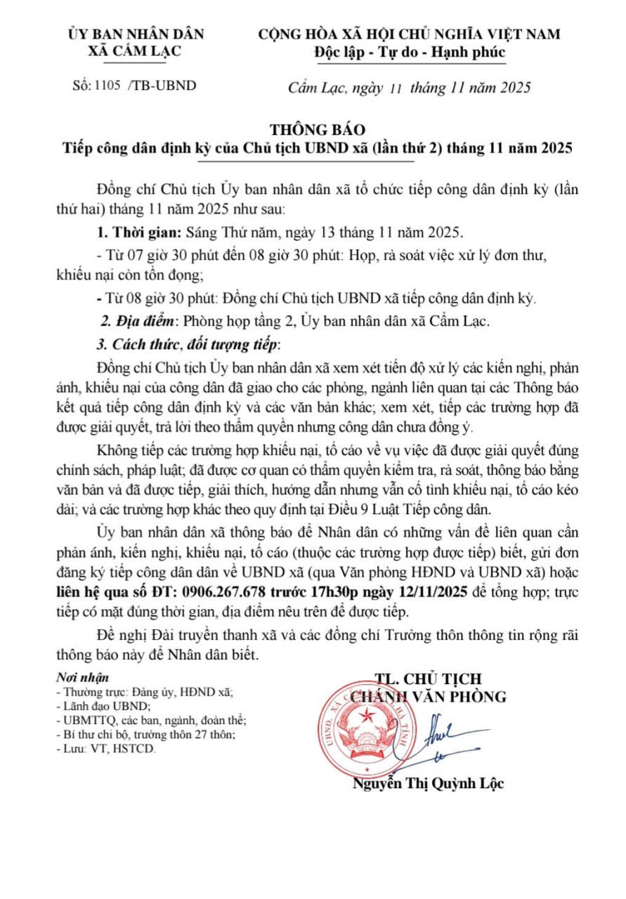 Lịch tiếp công dân định kỳ tháng 11 năm 2025 ( lần thứ 2 ) của đồng chí Chủ tịch UBND xãUBND xã Cẩm Lạc11/11/2025Tin liên quanThông tin đường dây nóngThông báo: Lịch tiếp công dân định kỳ tháng 8 năm 2025