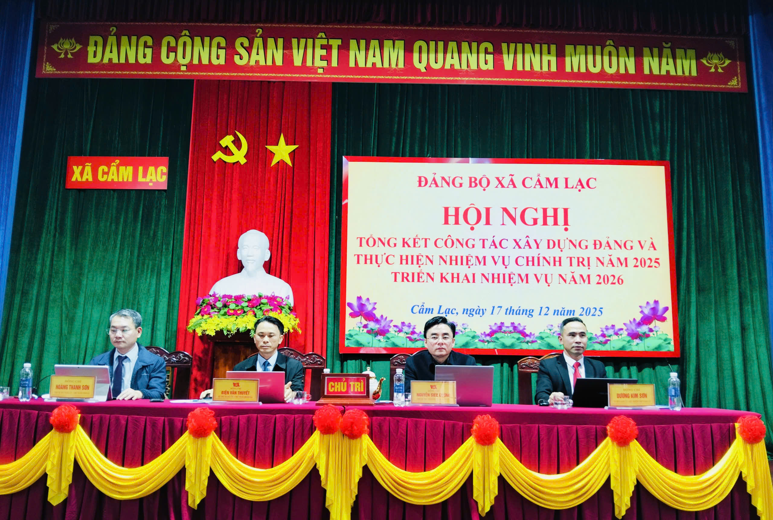Chiều 17/12/2025, Đảng bộ xã Cẩm Lạc tổ chức Hội nghị tổng kết công tác xây dựng Đảng và thực hiện nhiệm vụ chính trị năm 2025, triển khai nhiệm vụ năm 2026. Dự và chỉ đạo hội nghị về phía tỉnh có đồng chí Nguyễn Thanh Điện – TUV, Phó Trưởng ban Thường trực Ban Nội chính Tỉnh ủy; đồng chí Phan Ngọc Long – Phó Chủ nhiệm UBKT Tỉnh ủy; đồng chí Nguyễn Thị Nhuần – Trưởng Ban Pháp chế, Hội đồng Nhân dân tỉnh; cùng đại diện Ban Tuyên giáo Tỉnh ủy. Về Phía xã có đồng chí Biện Văn Thuyết – Bí thư Đảng ủy, Chủ tịch HĐND xã; đồng chí Nguyễn Siêu Cường – Phó Bí thư Thường trực Đảng ủy; đồng chí Hoàng Thanh Sơn – Phó Bí thư Đảng ủy, Chủ tịch UBND xã; các đồng chí trong Ban Thường vụ Đảng ủy, Ban Chấp hành Đảng bộ xã, đại diện các ban, ngành, đoàn thể, bí thư các chi bộ trực thuộc.