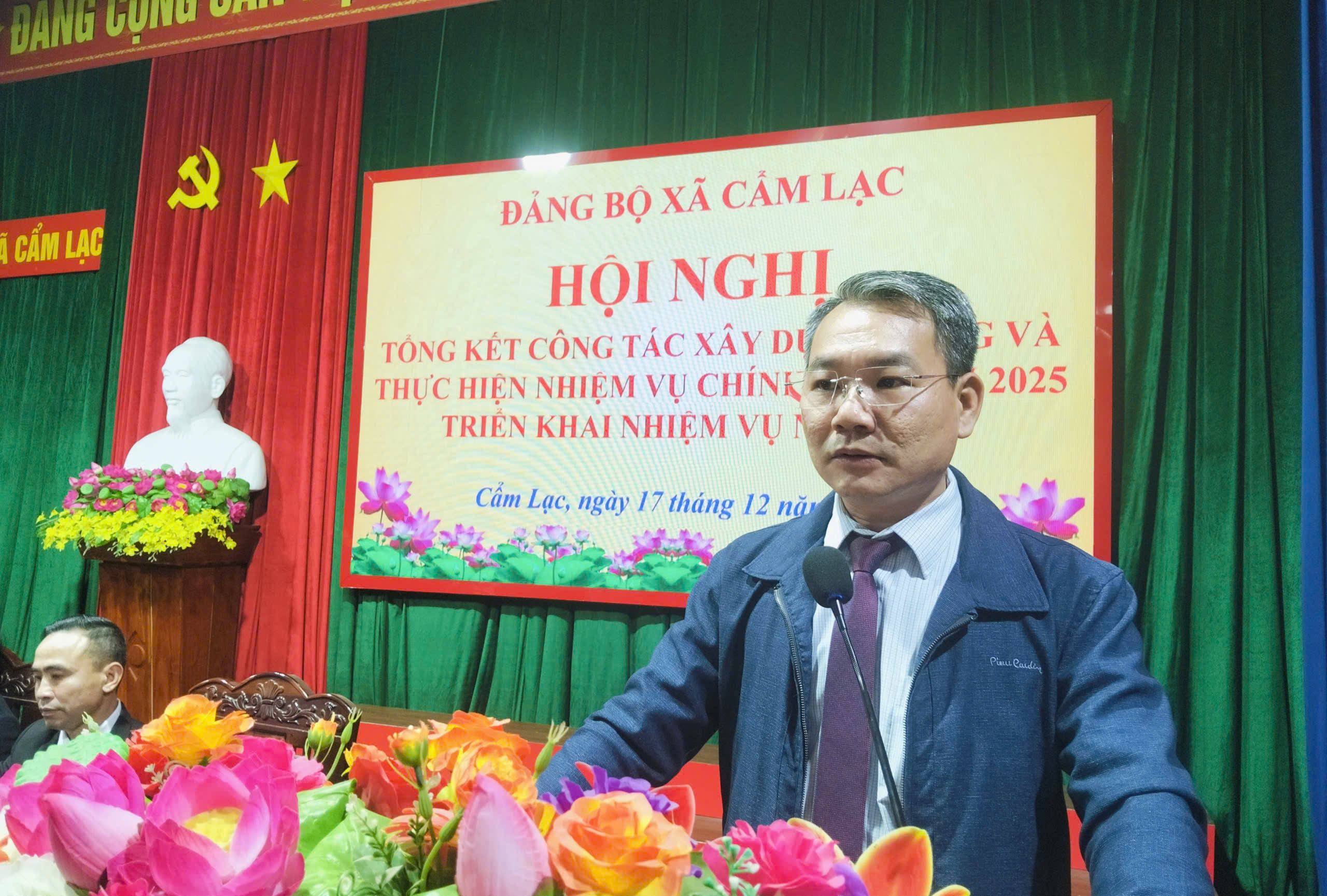 Phát biểu chỉ đạo tại hội nghị, đồng chí Nguyễn Thanh Điện – TUV, Phó Trưởng ban Thường trực Ban Nội chính Tỉnh ủy ghi nhận và biểu dương những kết quả mà Đảng bộ xã Cẩm Lạc đã đạt được trong năm 2025. Đồng chí nhấn mạnh: trong thời gian tới, Đảng bộ xã cần tập trung phát triển đảng viên, nhất là ở các đơn vị trường học và khu dân cư; xây dựng, củng cố chính quyền hai cấp hoạt động hiệu lực, hiệu quả; tiếp tục lãnh đạo phát triển kinh tế – xã hội, nâng cao đời sống nhân dân, đảm bảo quốc phòng – an ninh, trật tự an toàn xã hội.