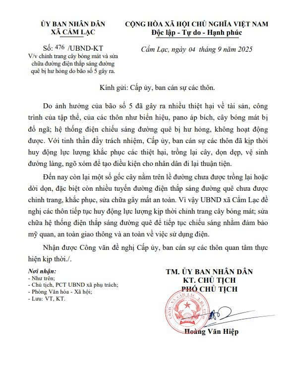 Thông báo của UBND xã Về việc chỉnh trang cây bóng mát và sửa chữa đường điện thắp sáng đường quê bị hư hỏng do bão số 5 gây raVP UBND04/09/2025A -A+VP UBND04/09/2025A -A+