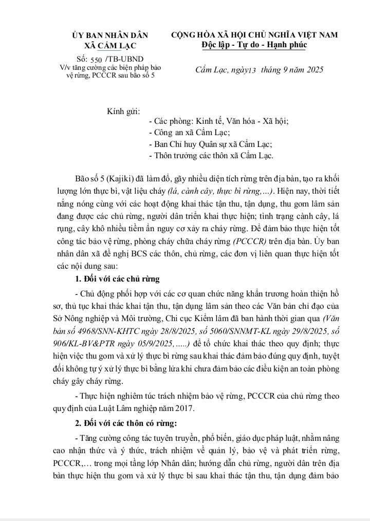 Thông báo về việc tăng cường các biện pháp bảo vệ rừng, PCCCR sau bão số 5VP UBND13/09/2025A -A+VP UBND13/09/2025A -A+