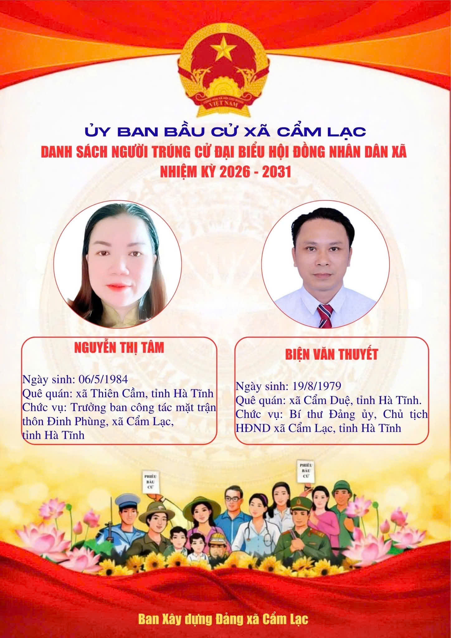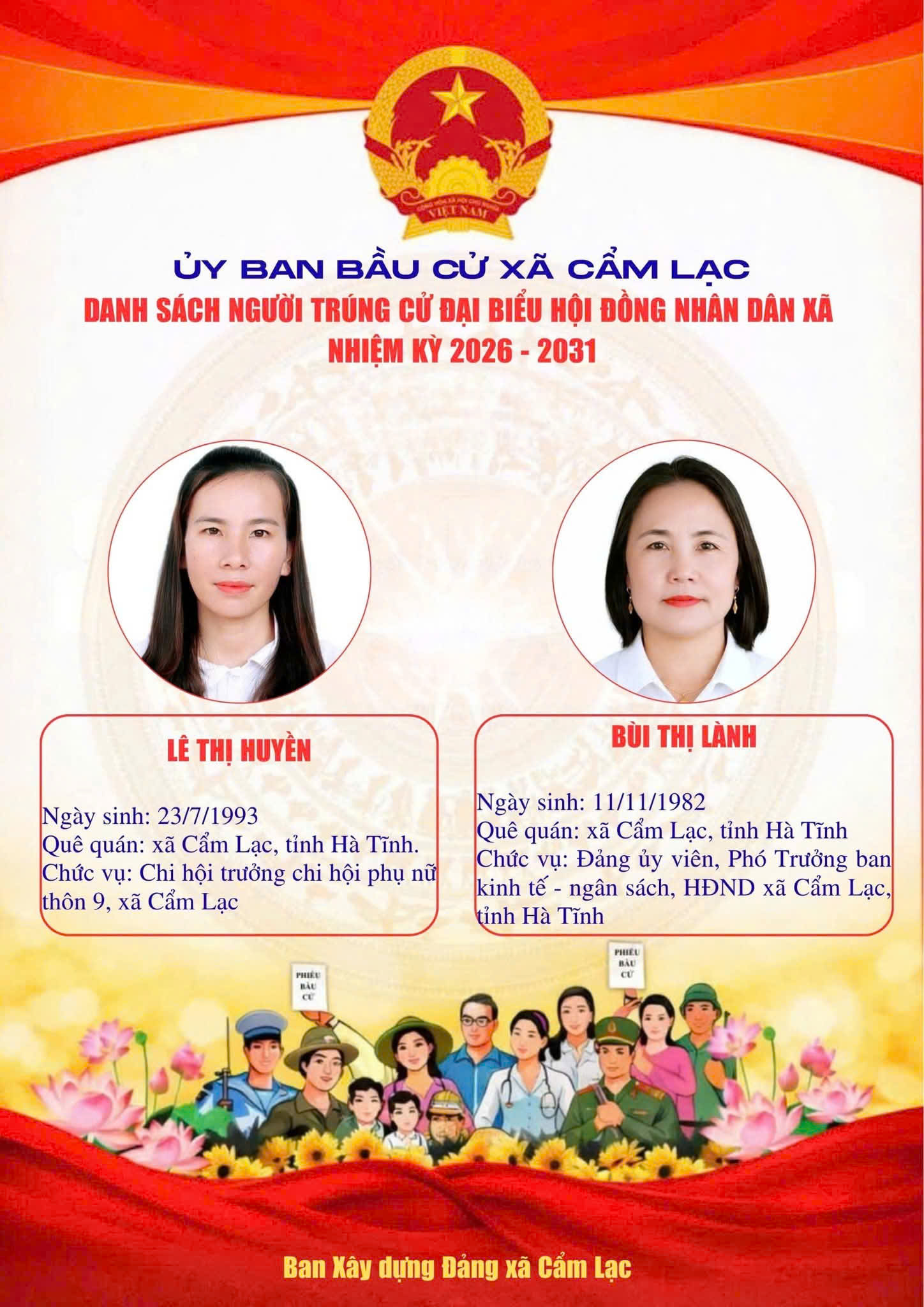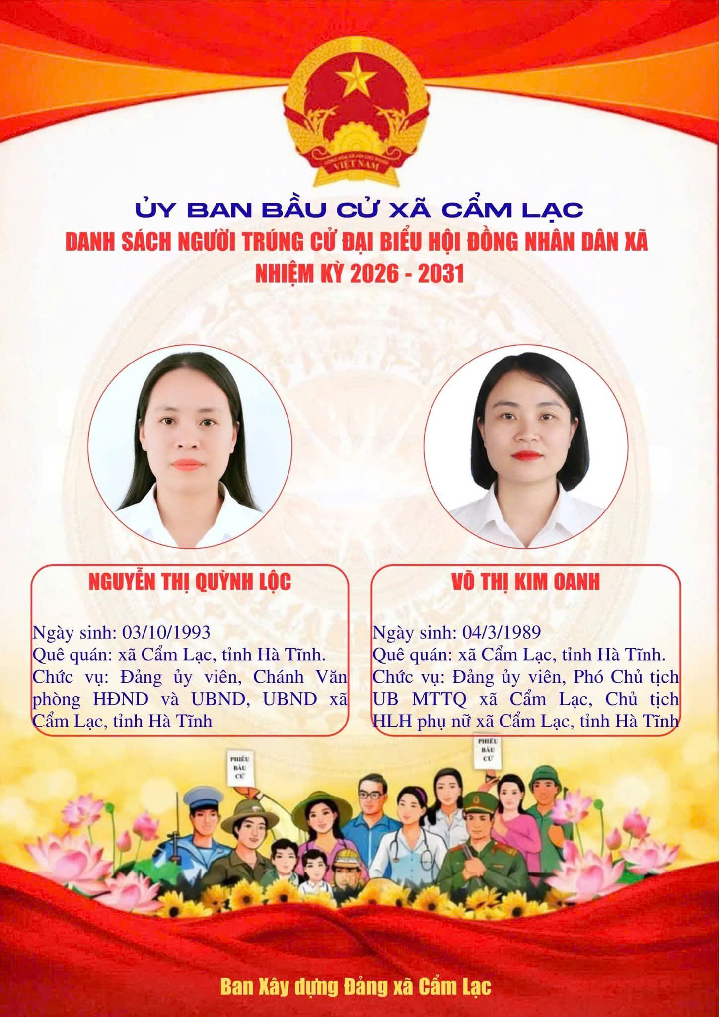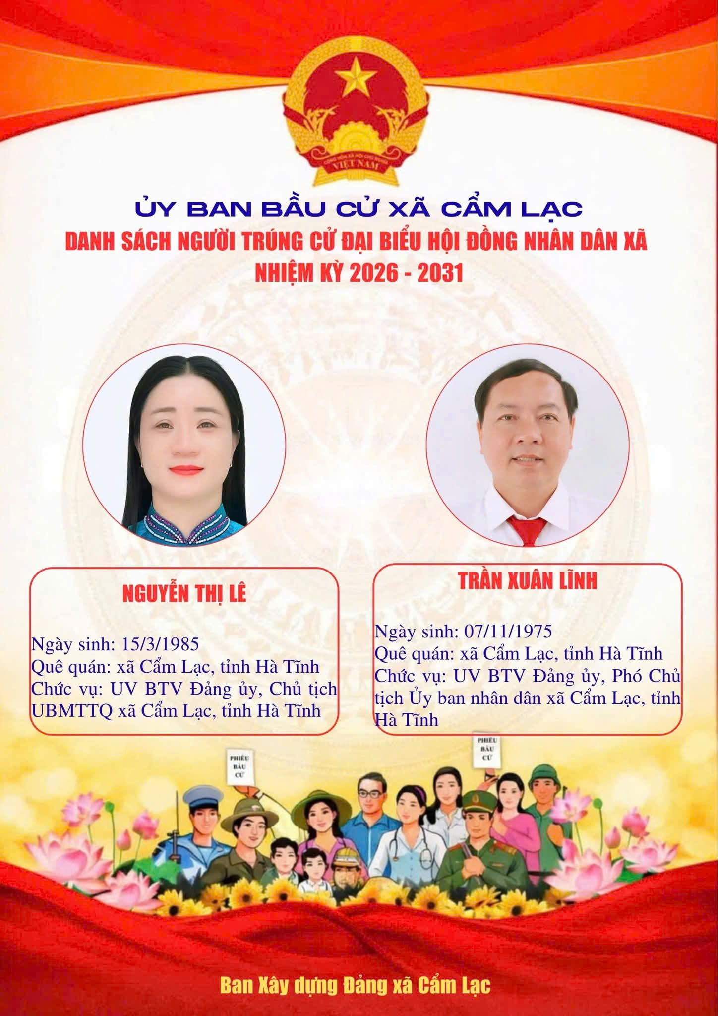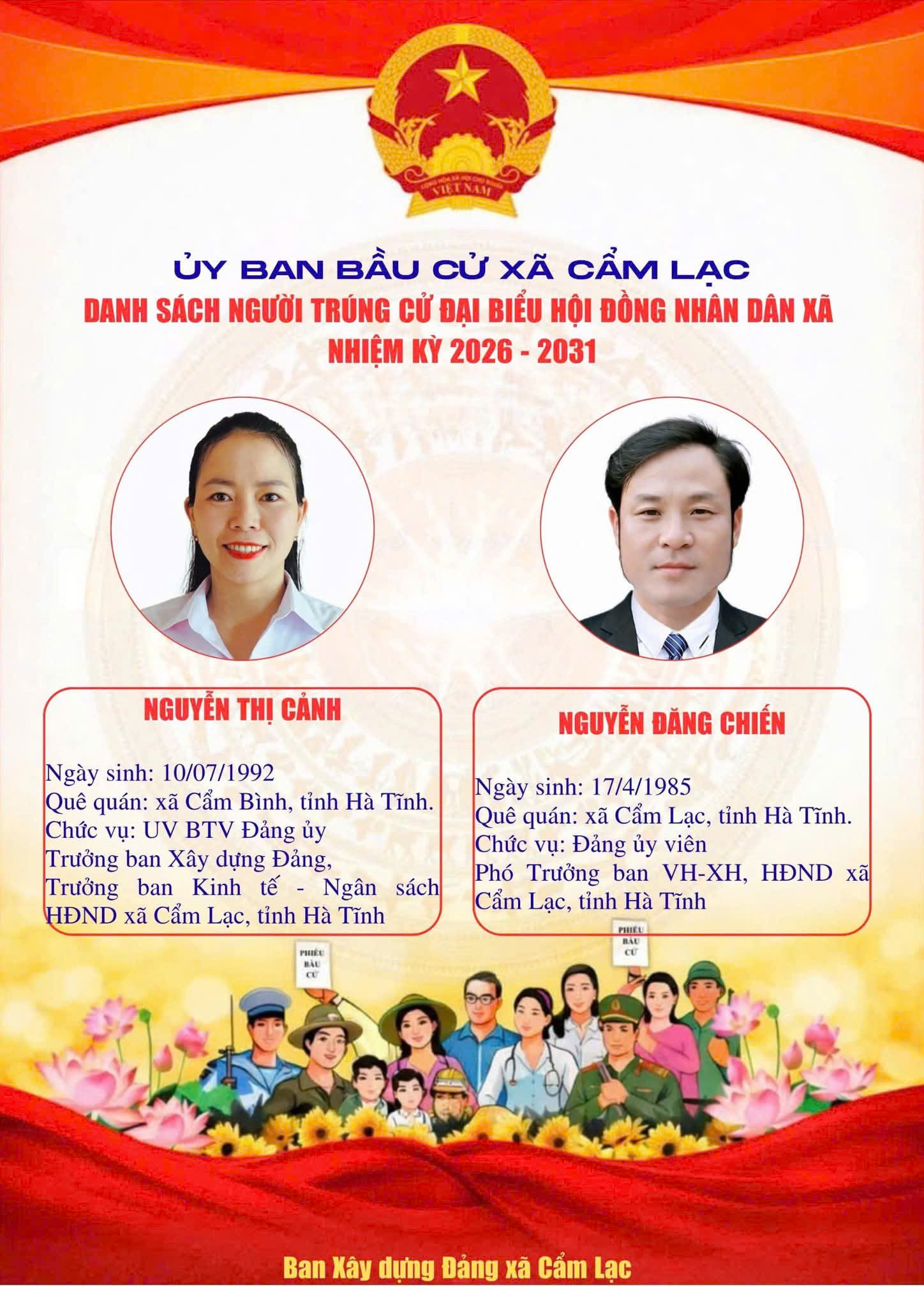 UBBC Xã Cẩm Lạc công bố danh sách người trúng cử Đại biểu HĐND xã Cẩm Lạc nhiệm kỳ 2026 - 2031Uỷ ban Bầu cử xã Cẩm Lạc21/03/2026A -A+Uỷ ban Bầu cử xã Cẩm Lạc21/03/2026A -A+