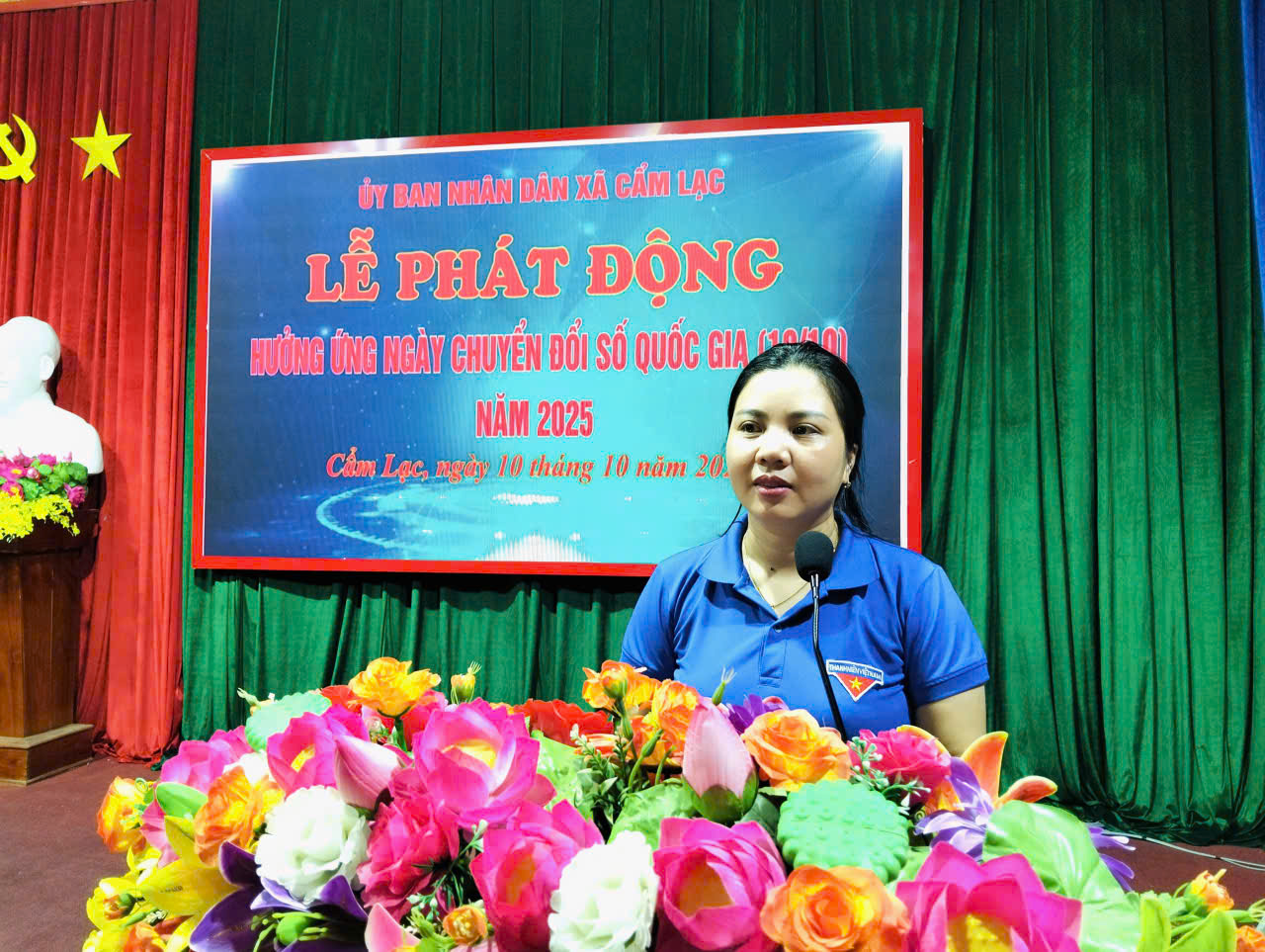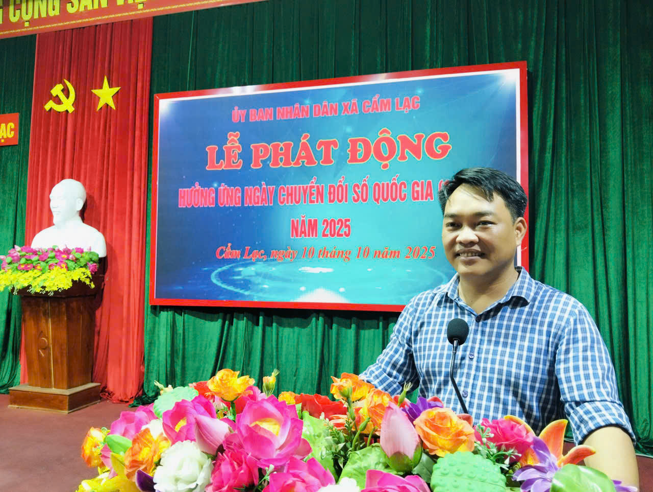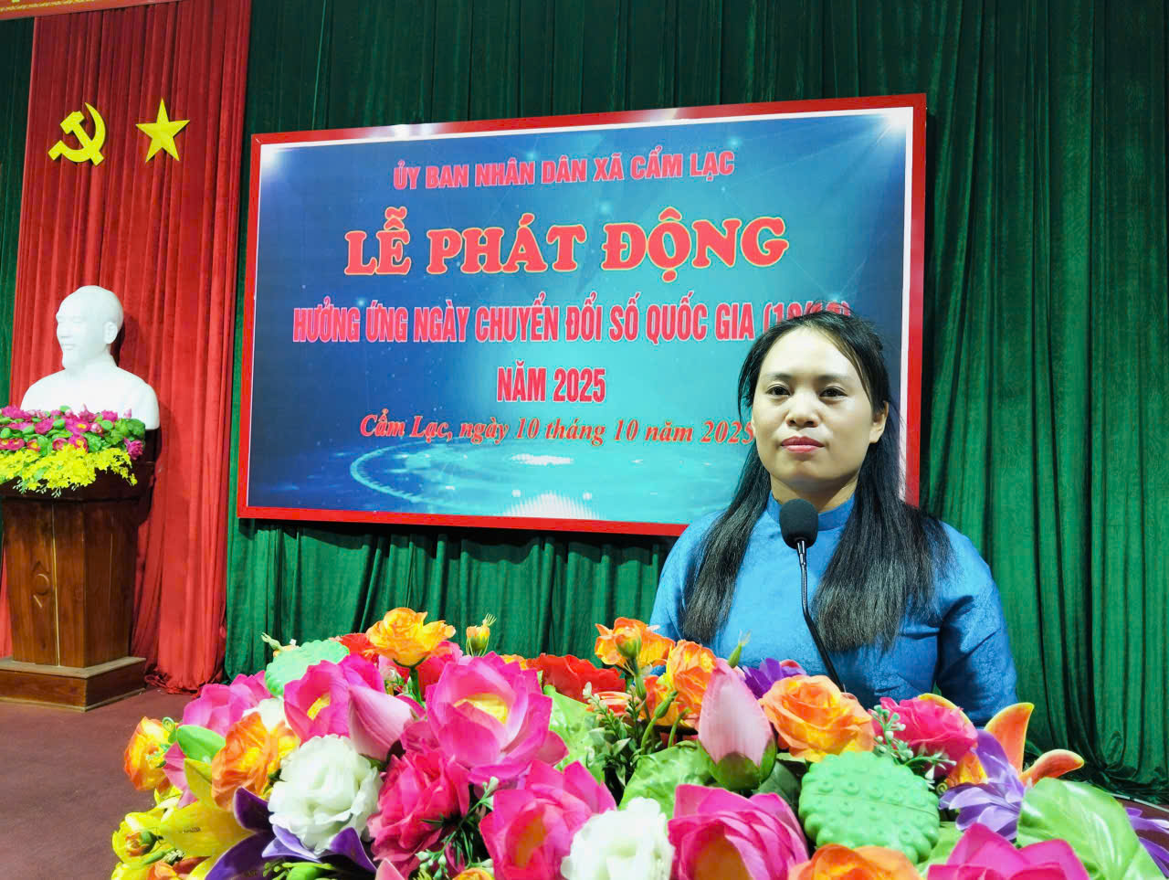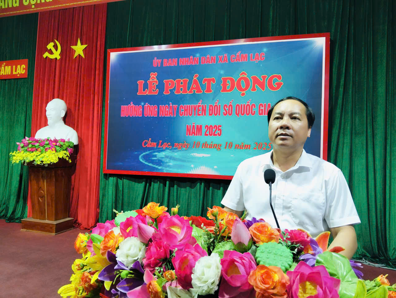 Tại buổi lễ, xã Cẩm Lạc đã phát động phong trào thi đua hưởng ứng ngày chuyển đổi số quốc gia năm 2025 với chủ đề “Chuyển đổi số nhanh hơn, hiệu quả hơn, gần dân hơn”. Ngay từ đầu tháng 10, UBND xã đã xây dựng kế hoạch tuyên truyền sâu rộng về vai trò, ý nghĩa của chuyển đổi số trong cải cách hành chính, phát triển kinh tế - xã hội và nâng cao chất lượng cuộc sống người dân. Các hình thức tuyên truyền được triển khai đa dạng qua hệ thống loa truyền thanh, bảng tin, pa-nô, áp phích, cũng như các nền tảng mạng xã hội của xã. Với phương châm “ Đi từng ngõ, gõ từng nhà, hướng dẫn từng người dân”. Hoạt động này nhằm lan tỏa tinh thần chủ động ứng dụng công nghệ số trong mọi lĩnh vực đời sống, góp phần nâng cao hiệu quả hoạt động của chính quyền, thúc đẩy phát triển kinh tế - xã hội trên địa bàn. Với tinh thần “mỗi người dân là một công dân số”, xã Cẩm Lạc đặt mục tiêu đến cuối năm 2025, 100% các hộ gia đình có điện thoại thông minh đủ điều kiện đều được hướng dẫn cài đặt và sử dụng các ứng dụng số thiết yếu, tối thiểu 80% thủ tục hành chính được thực hiện qua môi trường mạng.