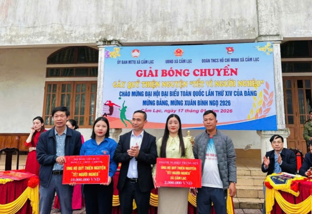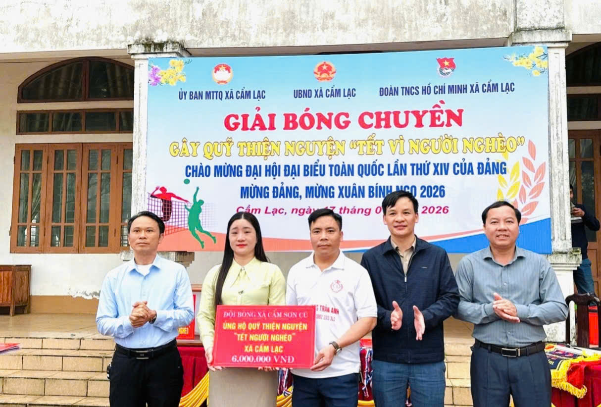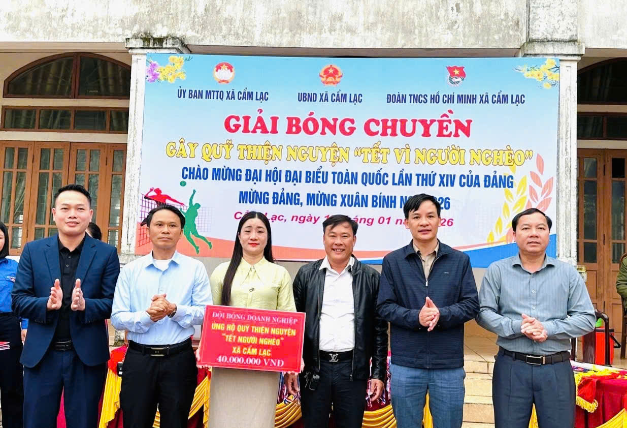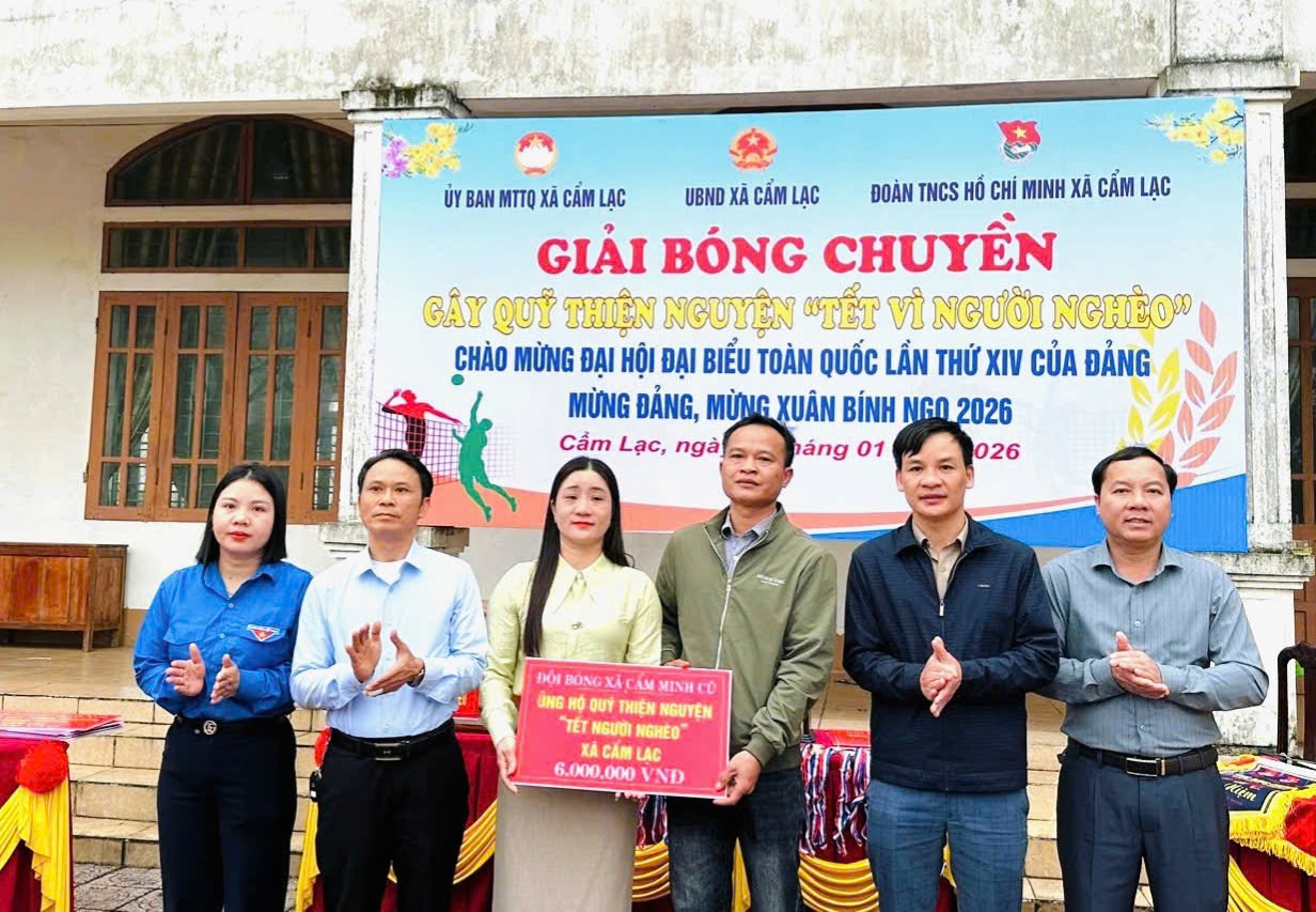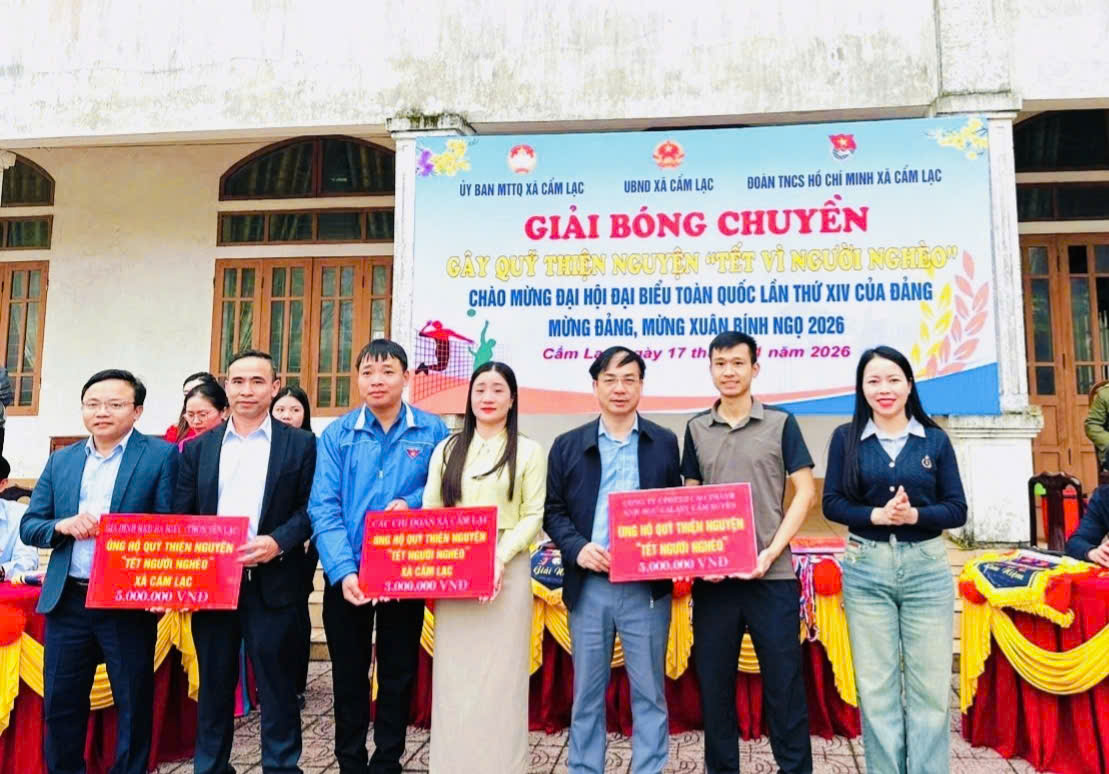 Nhằm thiết thực chăm lo, hỗ trợ các hộ nghèo, hộ cận nghèo và các hoàn cảnh khó khăn trên địa bàn nhân dịp Tết Nguyên đán, trong những ngày đầu năm 2026. Ngày 17/01/2026, Uỷ ban Mặt trận Tổ quốc Việt Nam xã Cẩm Lạc chủ trì, phối hợp với Phòng Văn hóa và Đoàn Thanh niên xã tổ chức Giải bóng chuyền nam gây quỹ thiện nguyện “Tết vì người nghèo”, thu hút sự tham gia, cổ vũ nhiệt tình của đông đảo cán bộ, nhân dân và các đơn vị trên địa bàn.